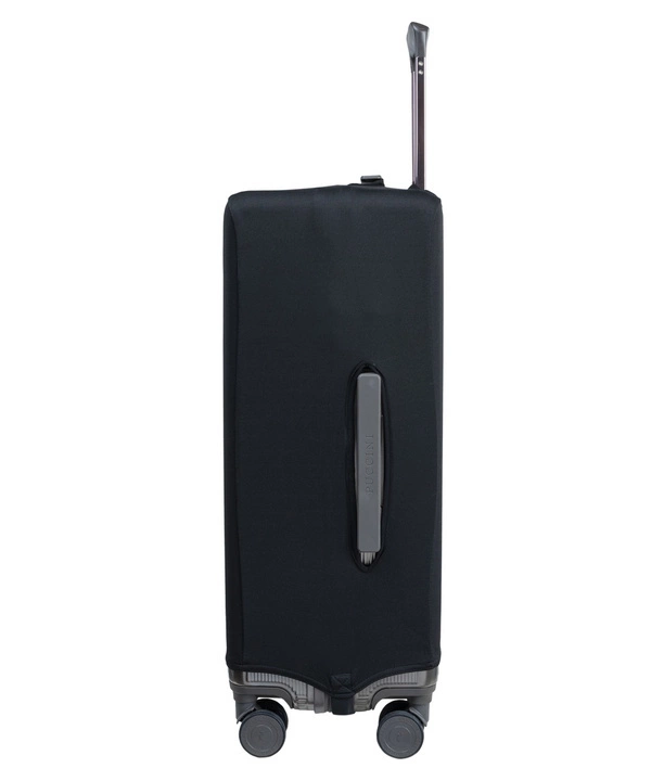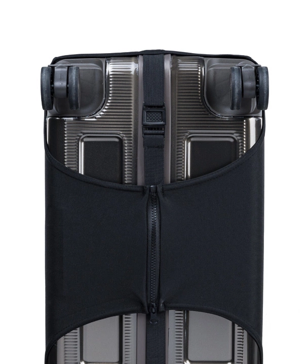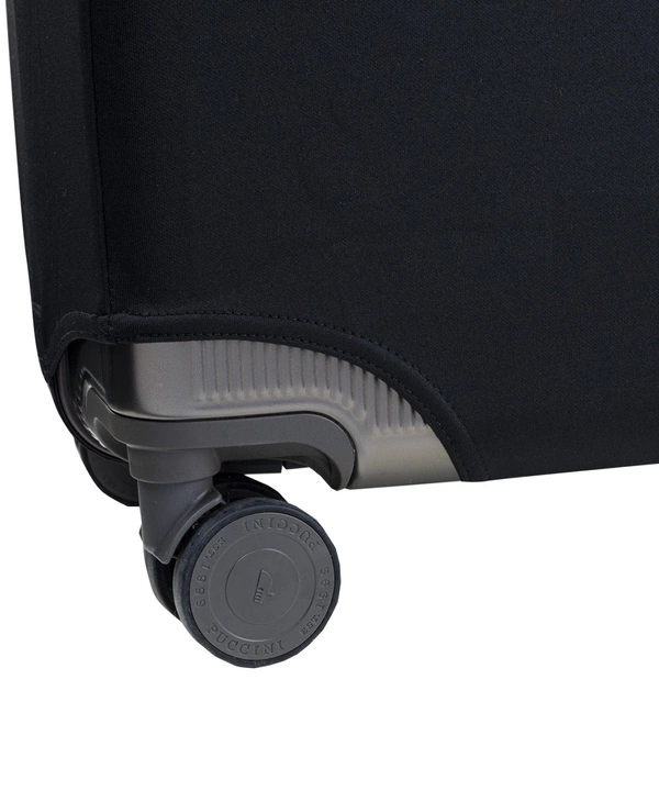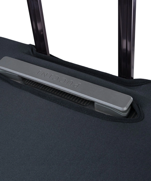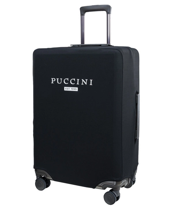 Ochronny pokrowiec na walizkę wykonany z wysokiej jakości poliestru zabezpieczy bagaż przed przypadkowym rozpięciem zamków oraz mechanicznymi uszkodzeniami zewnętrznymi. Elegancki model w kolorze czarnym, z dużym kontrastowym (białym) napisem Puccini z pewnością wyróżni walizkę spośród innych bagaży. Pokrowiec posiada otwory na teleskopową rączkę oraz uchwyty. Akcesorium zapinane jest na zamek, co więcej posiada dodatkowe zabezpieczenie w postaci elastycznych gum zapinanych klamrą.