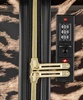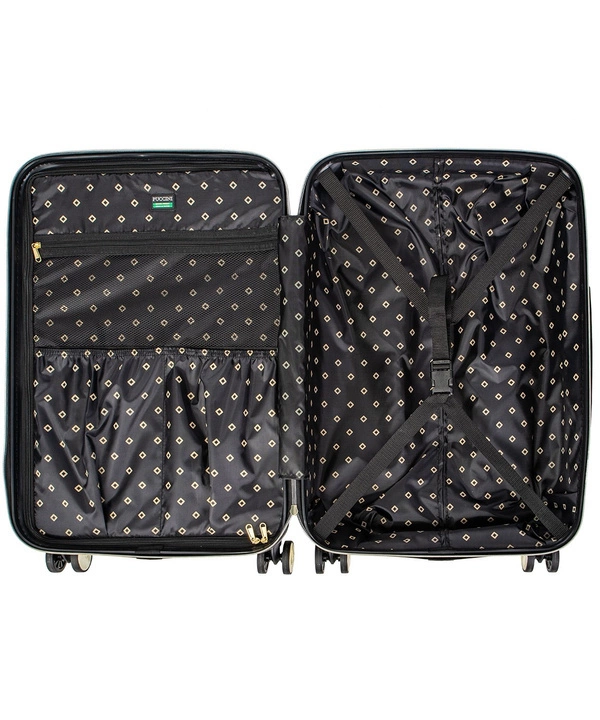 Główna komora walizki podzielona jest na dwie części. Frontową komorę zamyka przegroda z naszytymi na niej kieszeniami: dwoma otwartymi oraz przezroczystą zapinaną na suwak, które zdecydowanie ułatwią organizacje bagażu. Druga komora posiada elastyczne pasy mocujące, służące do przymocowania odzieży, dzięki czemu dotrze ona na miejsce w idealnym stanie. Wnętrze wyścielane jest elegancką, czarną podszewką w geometryczny wzór. Wszystkie elementy metalowe są w kolorze złotym.