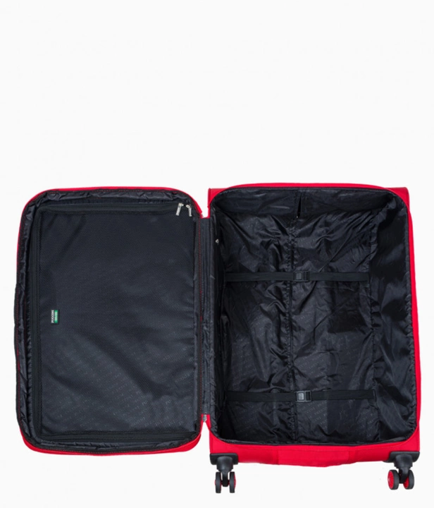 Skrupulatnie przemyślane wnętrze walizki zapewnia Państwu wygodę w pakowaniu i porządek podczas wyjazdu. Dzięki pasom, zapobiegającym przemieszczaniu się zawartości możesz być pewien, że Twoja odzież i rzeczy osobiste dotrą do celu podróży w idealnym stanie, co więcej na wewnętrznej stronie klapy zamykającej walizkę została umieszczona duża kieszeń z siatki. Dodatkowo na panelu frontowym znajdują się dwie funkcjonalne kieszenie zapinane na suwak: mniejsza i większa. Niezaprzeczalny atutem prezentowanych walizek Puccini z kolekcji Perugia, to możliwość powiększenia pojemności we wszystkich rozmiarach walizki (duża, średnia i kabinowa). Dzięki zastosowaniu dodatkowego zamka, każda walizka może zwiększyć swoją pojemność nawet o 20% . Wnętrze walizki wyścielane jest logowanym materiałem z poliestru.