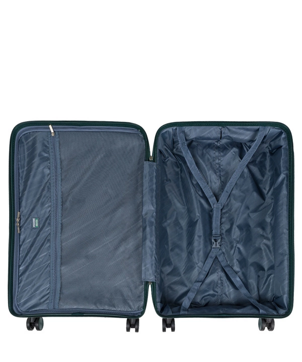 Wnętrze dużej walizki Zadar zostało zaprojektowane z dbałością o szczegóły, zapewniając wygodę pakowania oraz utrzymanie porządku. Główna komora została podzielona na dwie części, z których każda oferuje różnorodne opcje organizacji. Pierwsza część wyposażona jest w regulowane pasy, stabilizujące zawartość, natomiast druga posiada przegrodę na zamek oraz praktyczną kieszeń z siatki na drobne przedmioty.