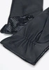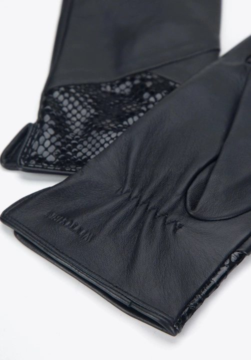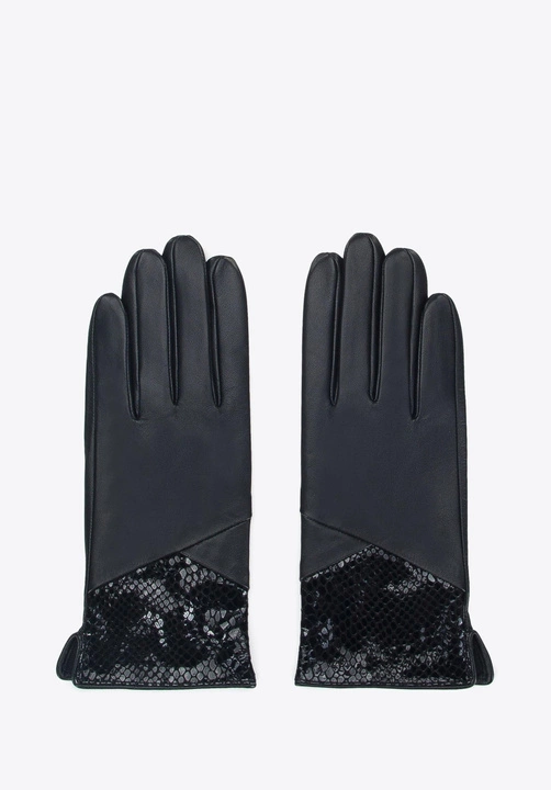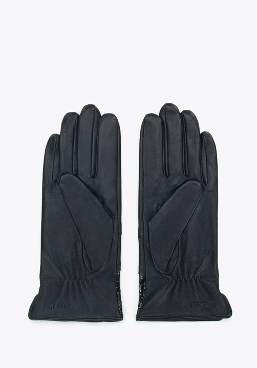 Te damskie rękawiczki to klasyka z nowoczesnym wykończeniem. Wykonane zostały z wysokiej jakości skóry naturalnej, która jest bardzo przyjemna w dotyku. Przy nadgarstku znajduje się wstawka, która delikatnie połyskuje i nadaje im nowego charakteru. Od spodu mają wszytą gumkę, dzięki której dobrze dopasowują się do dłoni i łatwo je założysz. Ten model doda blasku klasycznemu płaszczowi i świetnie dopełni puchową kurtkę. Damskie rękawiczki skórzane ze wstawką o fakturze egzotycznej skóry wprowadzą nowy styl do Twojej szafy.Nasza rada: jeśli chcesz wyeksponować wzór, noś je do kurtek lub płaszczy z rękawem ¾.