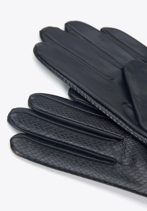 Te stylowe damskie rękawiczki urozmaicą każdą Twoją stylizację. Przód wykonany jest z połyskującej skóry o fakturze lizard, tył natomiast wykończono gładką skórą naturalną. Krótki fason z zapięciem na nadgarstku to świetny wybór na wiosnę i jesień. Ten model będzie świetnie wyglądał do kurtki lub płaszcza z rękawem ¾ , ukazując część przedramienia wraz z zegarkiem i biżuterią. Damskie rękawiczki samochodowe ze skóry lizard to oryginalny dodatek, który warto mieć w swojej szafie.