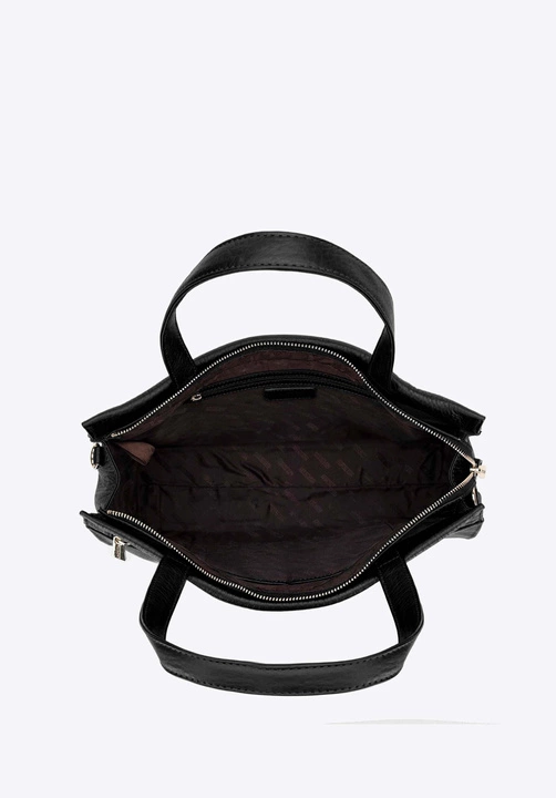 - Przemyślana organizacja: Shopperka ma trzy komory – dwie boczne zapinane na zatrzask oraz jedną główną zamykaną na zamek. W głównej komorze znajduje się kieszeń na zamek oraz dwie otwarte kieszonki, co ułatwia organizację drobiazgów, takich jak telefon, klucze, kosmetyki czy portfel.