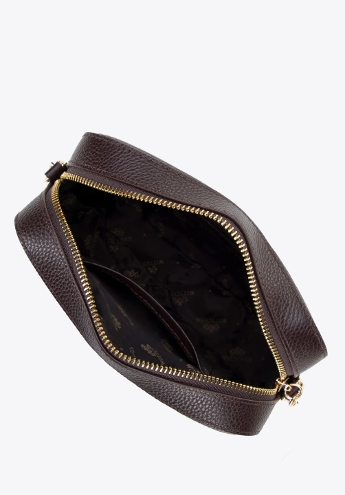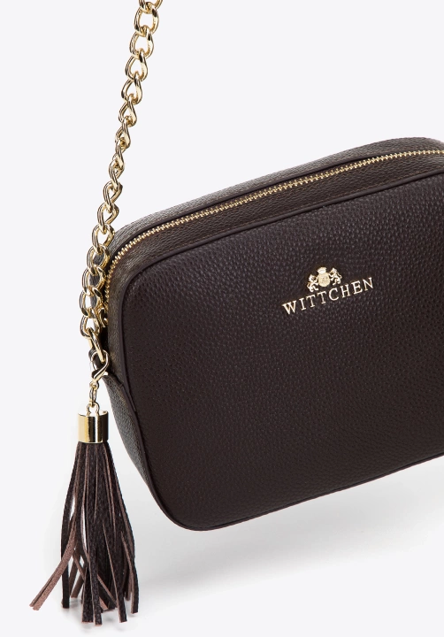Elegancka torebka na błyszczącym łańcuszku z pudełkowym, sztywnym kształtem to perfekcyjny wybór na wyjątkowe okazje. Mimo swojej kompaktowej formy pomieści najpotrzebniejsze rzeczy, takie jak portfel, telefon, chusteczki czy krem do rąk. Wykonana z wysokiej jakości skóry naturalnej o subtelnym groszkowym wzorze, zapewnia elegancję i trwałość na długie lata.