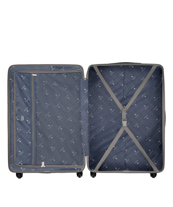 Eleganckie żebrowania na całej powierzchni dodają jej stylowego wyglądu. Wnętrze walizki jest podzielone na dwie części. Jedna jest zapinana na pasy, które umożliwiają przymocowanie bagażu. Natomiast druga komora jest zamykana klapką z dodatkową siatkową kieszonką.
