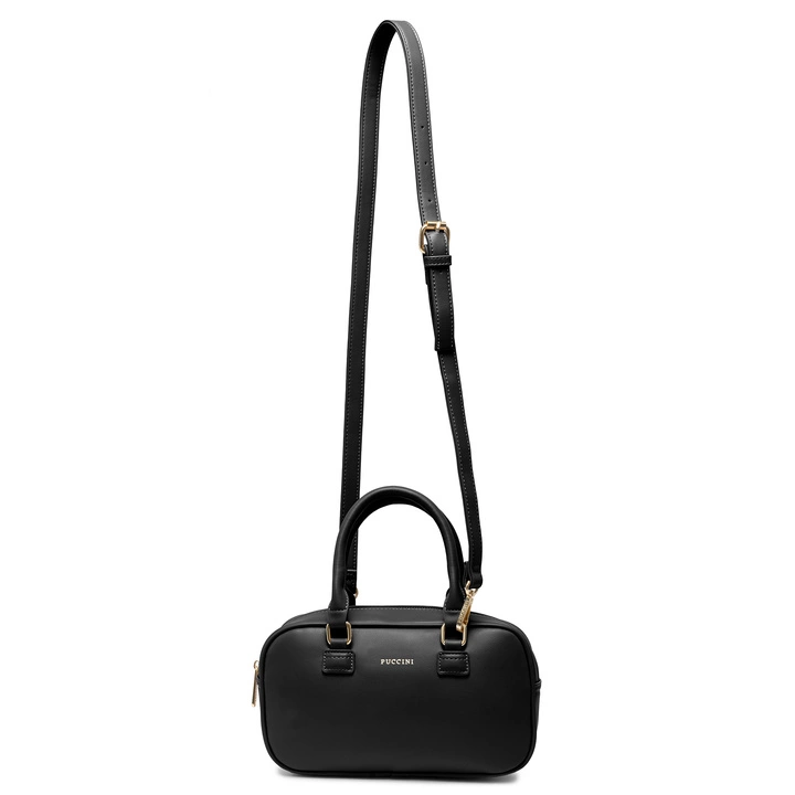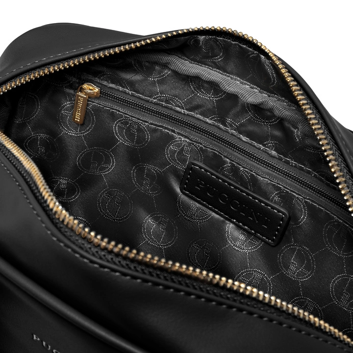 Torebka została wyposażona w krótkie uchwyty oraz odpinany, regulowany pasek które umożliwiają noszenie jej w dłoni, na ramieniu lub crossbody. Wnętrze wyściełane jest logowaną podszewką, a wszystkie elementy metalowe są w kolorze złota.