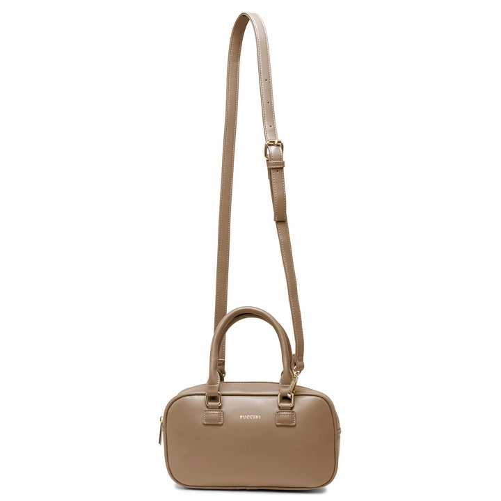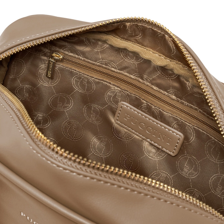 Torebka została wyposażona w krótkie uchwyty oraz odpinany, regulowany pasek które umożliwiają noszenie jej w dłoni, na ramieniu lub crossbody. Wnętrze wyściełane jest logowaną podszewką, a wszystkie elementy metalowe są w kolorze złota.