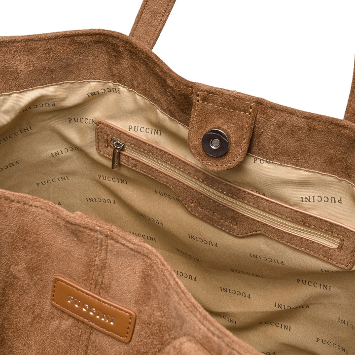 Model został wykonany z wysokiej jakości zamszu ekologicznego. Torebka posiada jedną komorę zamykaną na magnesowy zatrzask. W środku znajdziemy trzy kieszenie na drobne przedmioty: dwie otwarte i jedną zapinaną suwakiem. Shopperka o klasycznym, prostokątnym kształcie jest bardzo pojemna, swobodnie pomieści format A4.