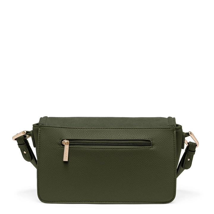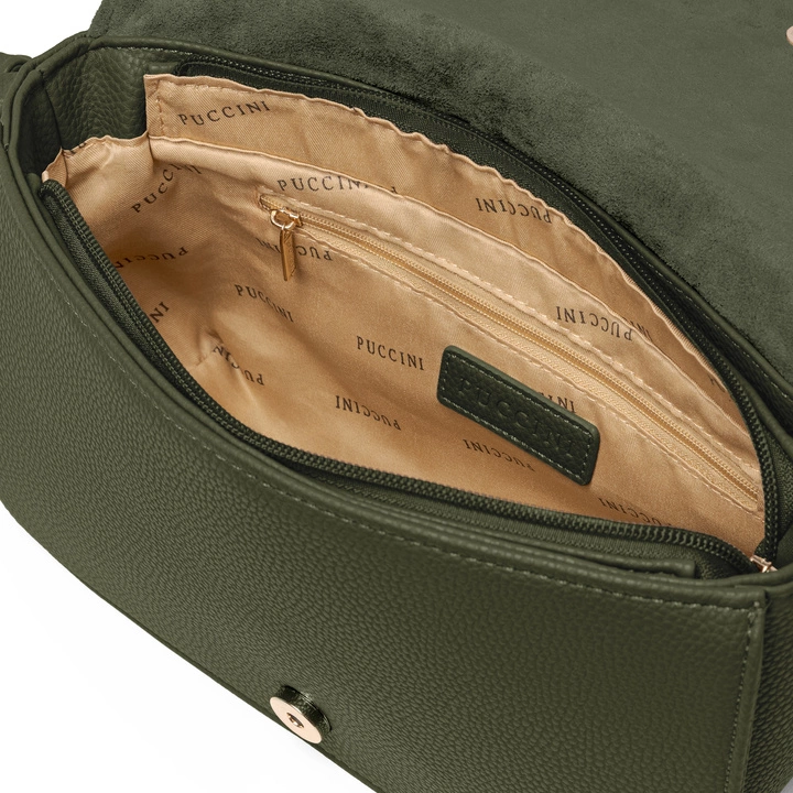 Torebka została zaprojektowana z dbałością o każdy detal. Model zamykany jest na zamek i klapę z magnesowym zatrzaskiem. W środku znajdują się dwie, małe kieszenie na drobiazgi: otwarta i zamykana suwakiem. Dodatkowo z tyłu torebki również znajdziemy funkcjonalną, zamykaną kieszeń. Wnętrze wyściełane zostało logowaną podszewką.