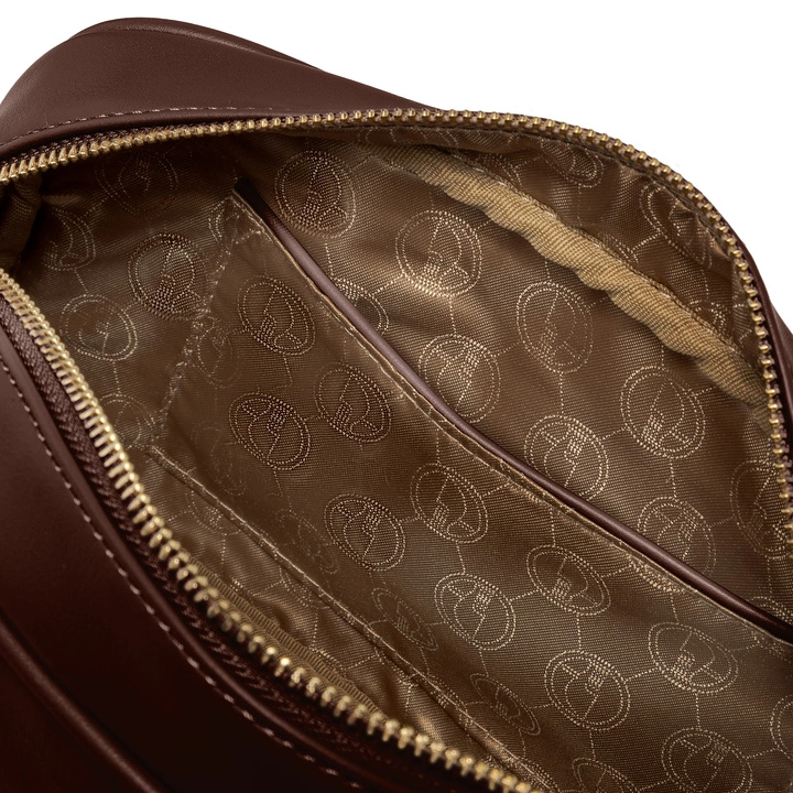 Torebka została wyposażona w krótkie uchwyty oraz odpinany, regulowany pasek które umożliwiają noszenie jej w dłoni, na ramieniu lub crossbody. Wnętrze wyściełane jest logowaną podszewką, a wszystkie elementy metalowe są w kolorze złota.