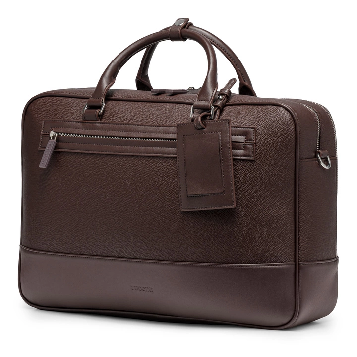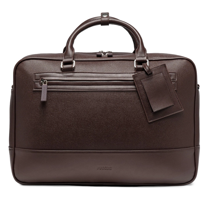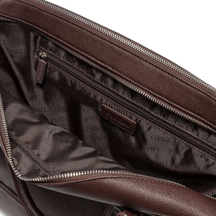 Torba została wykonana z wysokiej jakości skóry ekologicznej, dzięki czemu prezentuje się niezwykle elegancko. Front modelu zdobi duża kieszeń na zamek, subtelny napis PUCCINI oraz praktyczny name tag. Fason posiada dwie komory. Pierwsza doskonale sprawdzi się do przechowywania dokumentów, w jej wnętrzu znajduje się również mała kieszeń na drobiazgi zamykana suwakiem. W drugiej komorze znajdziemy dedykowane miejsce na laptop o maksymalnej wielkości matrycy 15 cali.
