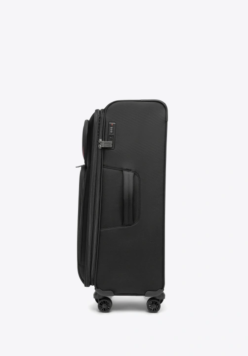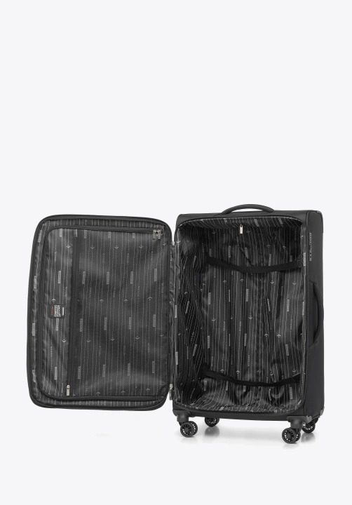 Przestronna, solidna i funkcjonalna — ta duża walizka z kolekcji Prime Line została stworzona dla osób, które potrzebują dużo miejsca, nie rezygnując z komfortu i porządku. Wykonana w 100% z poliestru, z możliwością poszerzenia o 4 cm, łączy trwałość z nowoczesnym designem. Cztery podwójne kółka, teleskopowa rączka z blokadą oraz uchwyty — górny i boczny — zapewniają łatwe prowadzenie, pewne podnoszenie i wygodną obsługę nawet pełnego bagażu.