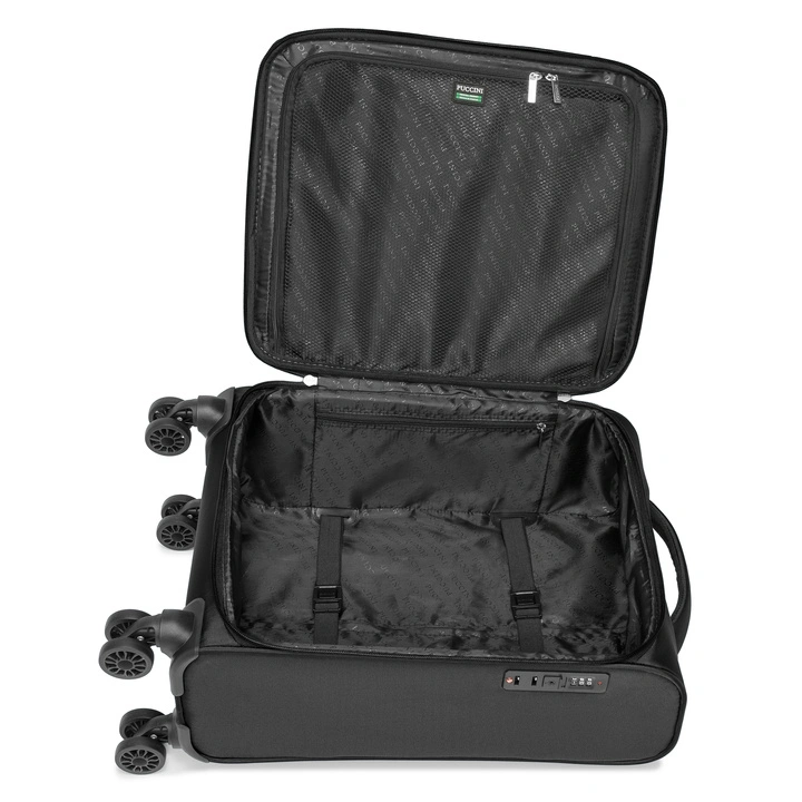 Walizka została wykonana z wysokiej jakości ultra lekkiego poliestru. Na froncie znajduje się duża, funkcjonalna kieszeń, idealna na rzeczy, do których chcemy mieć szybki dostęp. Dodatkowo z przodu została umieszczona mała kieszeń na zamek, która sprawdzi się do przechowywania drobnych przedmiotów. Główna komora walizki zawiera pasy utrzymujące całą zawartość bagażu na miejscu i małą kieszeń na suwak. Na klapie zamykającej całość znajdziemy dużą, praktyczną kieszeń z siatki.